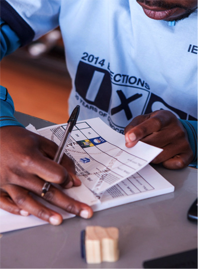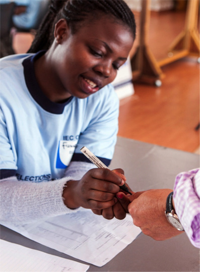 Once inside the voting station you will proceed to the voters' roll table where election officials will take your ID document and check for your name and identity number on the segment of the national common voters' roll for that voting district. Your name will then be crossed off – this is a manual mechanism for ensuring that voters only vote once. An election official will then ink your left thumb nail. This is a special ink that will not wash off your nail for several days. This ink mark will show everyone that you have participated in the election!